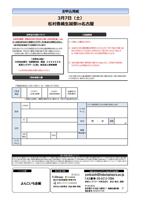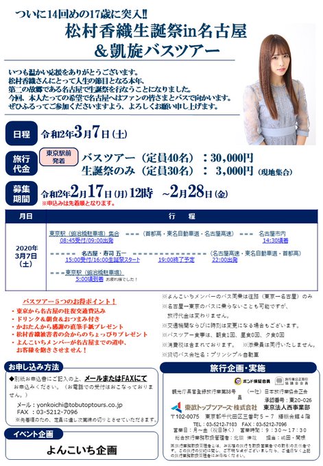 松村香織@kaotan_0117 -- おじさんたちにサプライズだと言われていた生誕祭🤣今、知ったよね🤣応募お待ちしてます🥺 twitter.com/yonkoichi_451/… よんこいち 「松村香織生誕祭in名古屋」開催!2020年3月7日(土)16時~19時 さらに「松村香織生誕祭」開催記念東京→名古屋凱旋バスツアー決定! 申込みは17日(月)12時~バスツアー(定員40人)、生誕祭のみ(定員30人)ともに先着順!申込書を(xfs.jp/GJsEd)記入のうえ、メールかFAXで! pic.twitter.com/ba9eXd3kfx