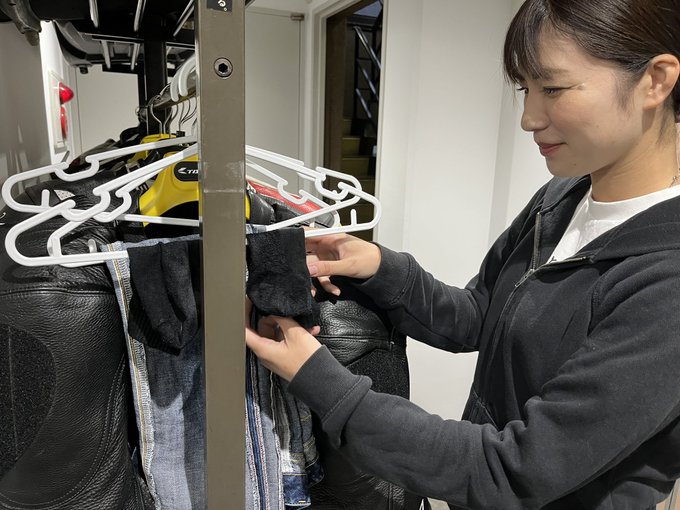 走行後はびしょ濡れのデニムと靴下を編集部で丁寧に陰干し。3枚目が何の写真かは、後日公開されるレポートでお確かめください!