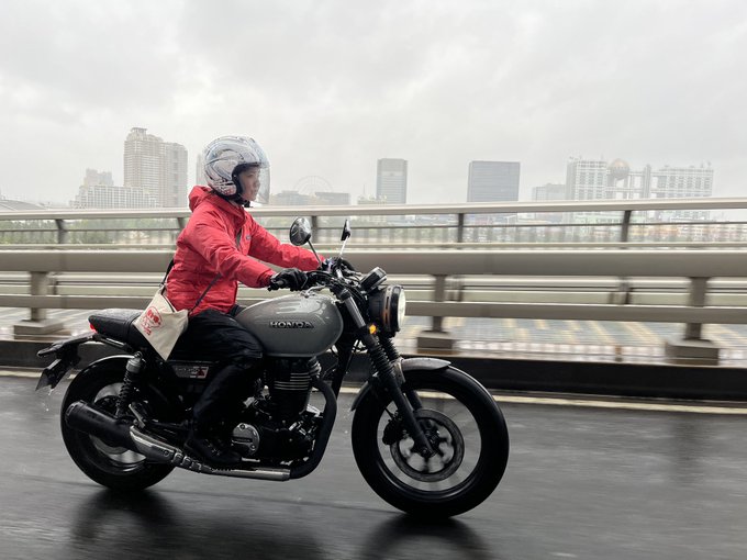 試乗レポートを書くために、大雨にも負けずホンダ GB350Sで都内を走り回っていた梅本まどかさん。