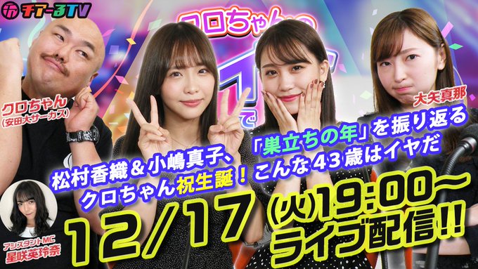 小嶋真子@mak0_k0jima -- 明後日お馴染みのクロちゃんのライブでするしん!に出演させていただきます♡ぜひに🥰🎁🍓 twitter.com/kzstation/stat… kana P <拡散希望>クロちゃん・大矢真那の『クロちゃんのライブでするしん!」12月17日 年内最後は2ゲスト‼️松村香織&小嶋真子がやってくる‼️🎅女子パワー全開でクロちゃんピンチ😎アシスタントMCは星咲英玲奈!#ライブでするしん pic.twitter.com/ltGpNdqkhn