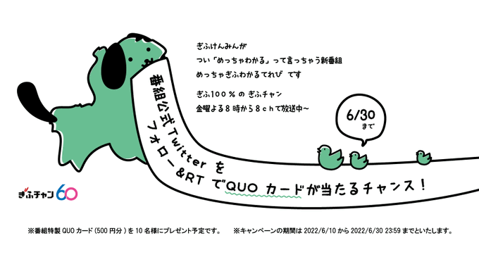 加藤るみ@kato_rumi0309 -- 【お知らせ】@metchagifu Twitterキャンペーン開催中!フォロー&リツイートでQUOカードが当たる!?日付け変わって、6/30までです!まだの方はぜひ参加してください〜! twitter.com/metchagifu/sta… めっちゃぎふわかるてれび /「めっちゃぎふわかるてれび」番組公式Twitterフォロー&RTキャンペーン\番組特製QUOカード(500円分)を10名様にプレゼント!①@metchagifu をフォロー②この投稿をRT(期間:2022/6/10~6/30 23:59)詳しくはこちら→zf-web.com/page/metchafol…#めっちゃぎふ pic.twitter.com/Mwvpaz7ZPc