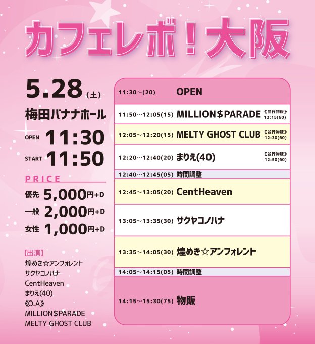 達家真姫宝🌹煌めき☆アンフォレント@makiho_1019 -- おはよ〜🥱本日は1日バナナホール!久しぶりの大阪!うれしいね!楽しみだね!お待ちしています!①🎤13:35~ 📸14:15~②🎤 18:10~📸19:00~ twitter.com/kirafore_info/… 煌めき☆アンフォレント \ カフェレボ!大阪 /🗓5/28(土)📍梅田バナナホール⏰OPEN 11:30 START 11:50👛優先入場 ¥5,000+D 一般 ¥2,000+D 女性 ¥1,000+D🎤13:35~(30) 🗣️14:15~(75)🎫5/20 18:00~t.livepocket.jp/e/0528cafeosaka pic.twitter.com/xSAN6gncSr