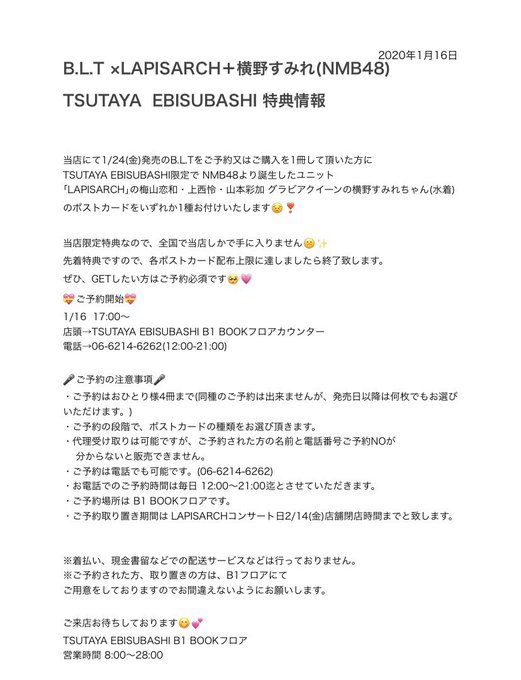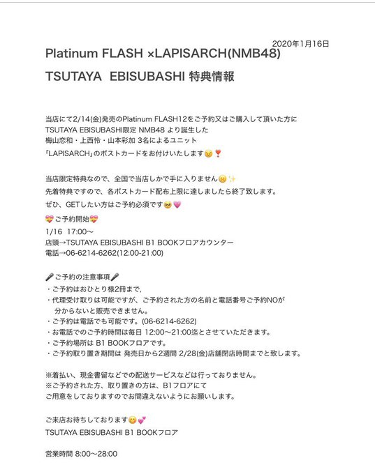 ご購入の方に #NMB48 より誕生した #梅山恋和ちゃん #上西怜ちゃん #山本彩加ちゃん 3名によるユニット #LAPISARCH のポストカードが当店限定でついてきます🙌🙌 pic.twitter.com/qxtTdQJzW8