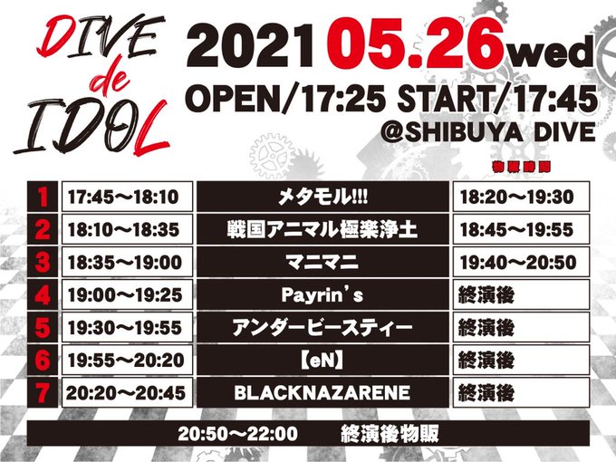相笠萌【メタモル!!!】@moeaigasa0406 -- トップバッターです!きてくれるかな🥲 twitter.com/metamol_fourze… メタモル!!! ⛓本日のイベント⛓5/26(水)DIVE de IDOL OPEN/START▶︎17:25/17:45会場▶︎SHIBUYA DIVEライブ▶︎17:45〜特典会▶︎18:20〜19:30入場特典▶︎ランダムチェキ📸(メンバー選択不可) pic.twitter.com/gyeXtLepg3
