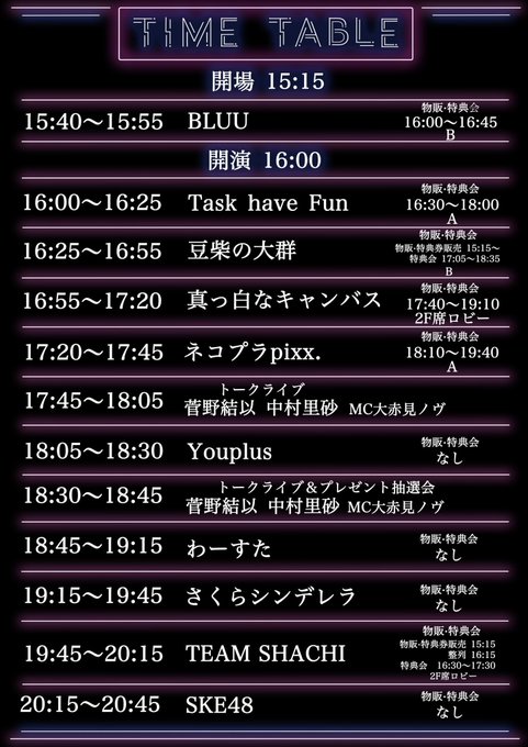 《出演》SKE48 / さくらシンデレラ / TEAM SHACHI / Task have Fun / ネコプラpixx. / 真っ白なキャンバス/豆柴の大群 /Youplus / わーすた