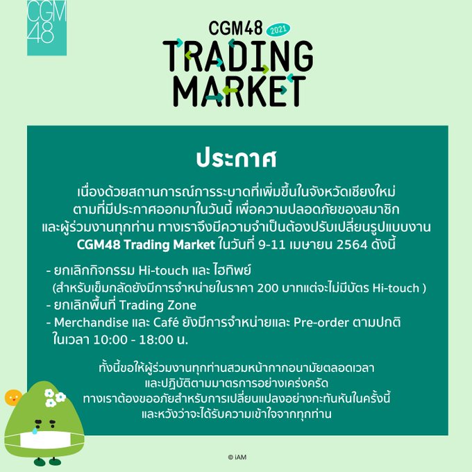ประกาศปรับเปลี่ยนรูปแบบงาน CGM48 Trading Market ในวันที่ 9-11 เมษายน 2564