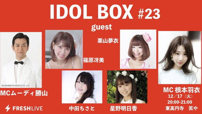 中田ちさと@chisatonakata0 -- 明日、よろしくお願いします!リプ予約も可能なのでぜひお待ちしております☺️💕 twitter.com/warayadelive/s… 笑や 明日です!12/17(火)IDOL BOX #23 OP19:45ST20:00ED20:45会場&FRESH!会員限定アフタートークあり(20:45-21:00)出演根本羽衣ムーディ勝山ゲスト栗山夢衣篠原冴美星野明日香中田ちさと料金予約2500円当日3000円(別1D)予約ws.formzu.net/fgen/S49887715/会場東高円寺 笑や pic.twitter.com/W0mPRoe7e3