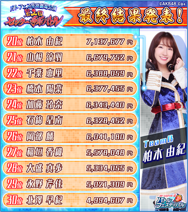 北澤早紀@Sakii_Kitazawa -- 30位!!!😳😳😳頑張ってくださった皆様ありがとうございます!!✨✨ twitter.com/akb48_battlefe… バトフェス(バトルフェスティバル) 👑『第2回センター争奪バトル』最終結果発表👑20位~30位までの最終結果はコチラ✨#AKB48 #センター争奪バトル #バトフェス pic.twitter.com/ueqPMHQ6dC
