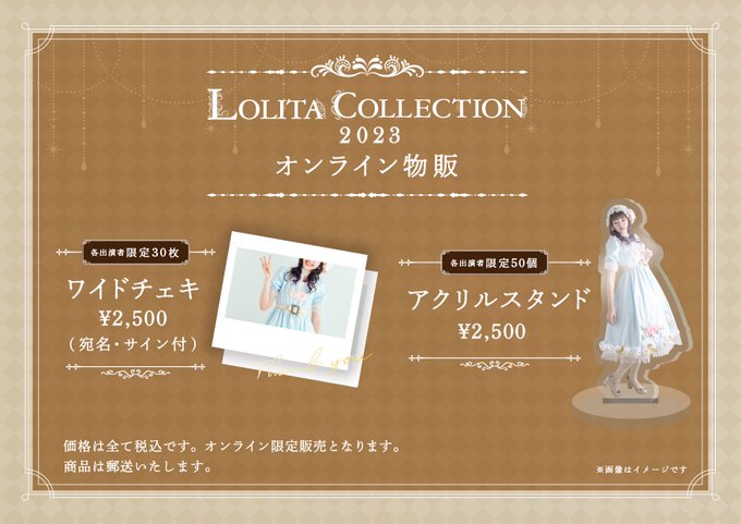 山田麻莉奈@maririchan_324 -- こちら本日23:59までみたいです!ぜひっ- ̗̀☾ ̖́- twitter.com/lc____official… Lolita Collection 2023 ꧁-ロリータコレクション2023-꧂♦️オンライン物販のお知らせ♦️💎ワイドチェキ(宛名・サイン付)¥2,500-各出演者限定30枚💎アクリルスタンド¥2,500-各出演者限定50個明日3/16 ⏳19:00発売開始!(先着での販売となっております)URLkinmaec.official.ec#ロリコレ2023 pic.twitter.com/LXE0MHEAF2
