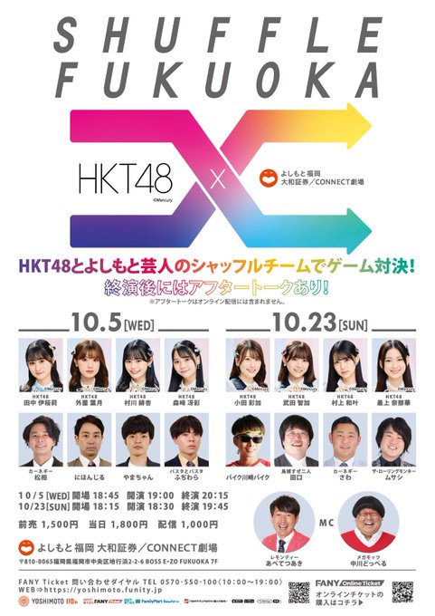 HKT48 武田智加@moka__0225 -- 明後日のシャッフク ぜひおまちしてます🫶🏻🫶🏻 twitter.com/fukuoka_ysmt/s… よしもと福岡 大和証券/CONNECT劇場 /10/23(日)18:30開演#シャッフク 出演者✨チケット絶賛発売中🎉\🌈MC#レモンティー #あべてつあき#メガモッツ #中川どっぺる🌈HKT48#小田彩加 #武田智加 #村上和叶 #最上奈那華🌈吉本芸人#バイク川崎バイク#田口恭平#カーネギー #さわとおる#ザ・ローリングモンキー #ムサシ pic.twitter.com/C5p35vRlRz