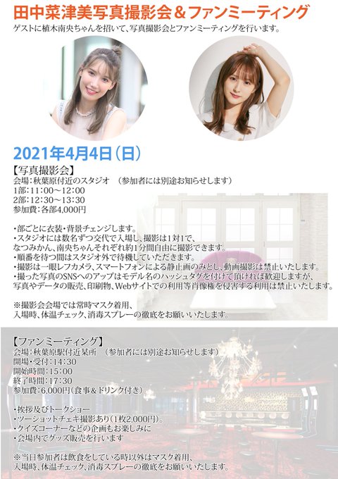 田中菜津美@mikanchiyan723 -- システムエラーの為明日以降の受付になります。🙇🏻♀️申し訳ありません💦 twitter.com/mikanchiyan723… 田中菜津美 【お知らせ】4月4日 東京秋葉原でイベントを開催します〜🌸ゲストは植木南央ちゃん✨詳細は下記のフライヤーをご覧下さい参加受付は3月19日20:00〜撮影会第1部passmarket.yahoo.co.jp/event/show/det…第二部passmarket.yahoo.co.jp/event/show/det…ファンミーティングpassmarket.yahoo.co.jp/event/show/det… pic.twitter.com/NHHAAGfaSC