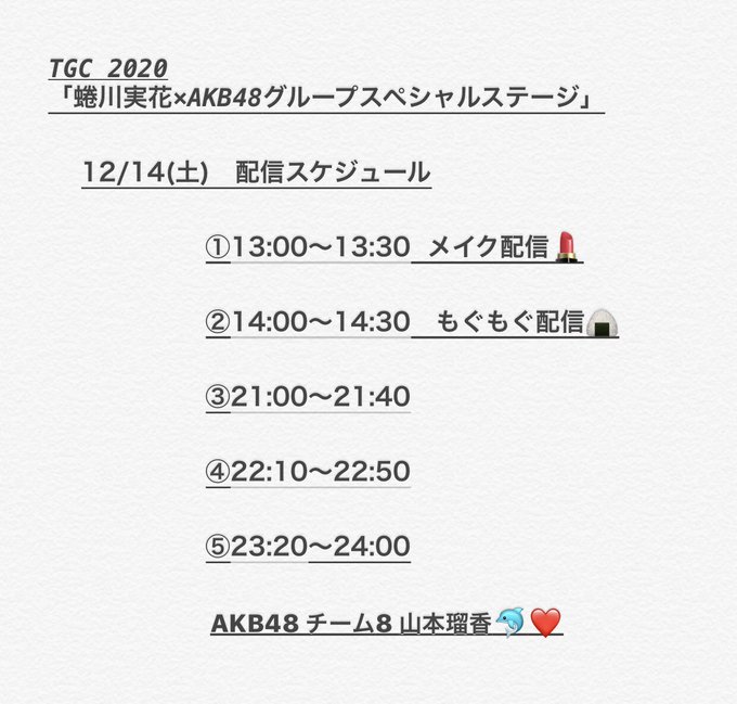 山本 瑠香@RUKA_1010_team8 -- TGC 2020 「蜷川実花×AKB48グループスペシャルステージ」今日の配信スケジュールです💟みんなと一緒に楽しみたい♪応援よよよよよよろしくね♪ pic.twitter.com/ySHSN4nkGX