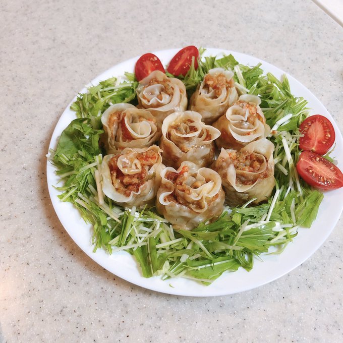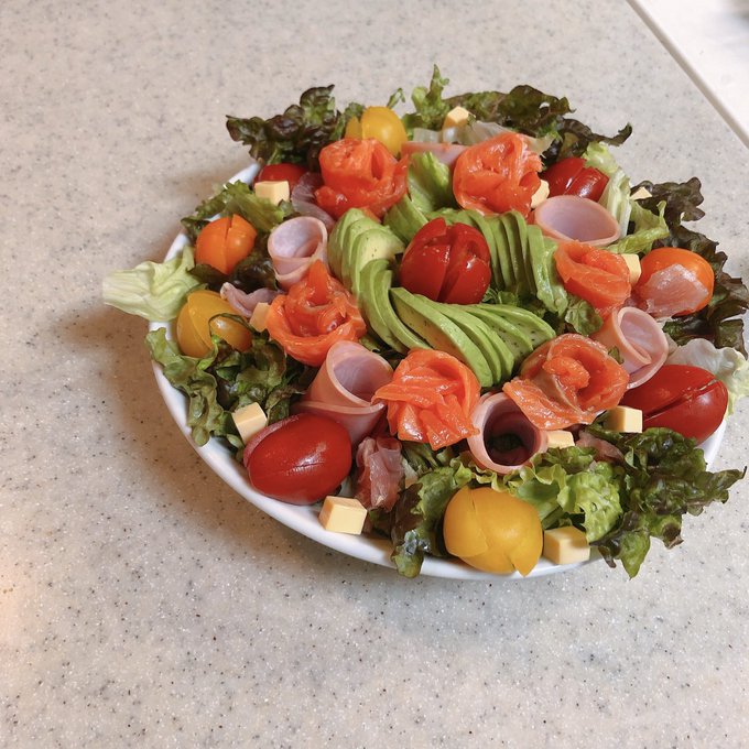 サラダとエビ焼売をお花っぽくしてみたよ〜🌷