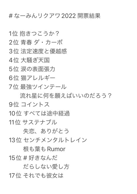 惜しくもランクインしなかった18位の7曲は 14日21:00~SHOWROOMで発表します🥗 pic.twitter.com/q5J50S5B5x