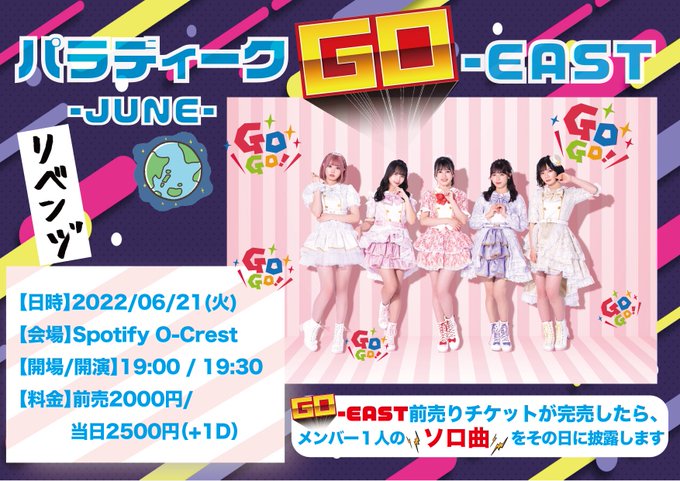 前田彩佳【パラディーク】@ayaka_pdq -- 完売しました!!!皆さんありがとうございます😳最高の一日にしましょうね🎶 twitter.com/para_deeq/stat… パラディーク 🎪🎪完売御礼🎪🎪6/21(火)#パラディーク『GO-EAST』@ Spotify O-CrestOPEN 19:00 / START 19:30🎫SOLDOUTt.livepocket.jp/e/go-east06メンバー1人のソロ曲披露決定🎉✨詳細⬇️paradeeq.com/news/558/ pic.twitter.com/e1nEDDKfDf