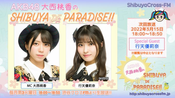本日3/15(火)18:00からの、AKB48チーム8 #大西桃香 の冠番組、渋谷クロスFM「AKB48 大西桃香のSHIBUYA DE PARADISE‼」は生放送でお届けします😍📢