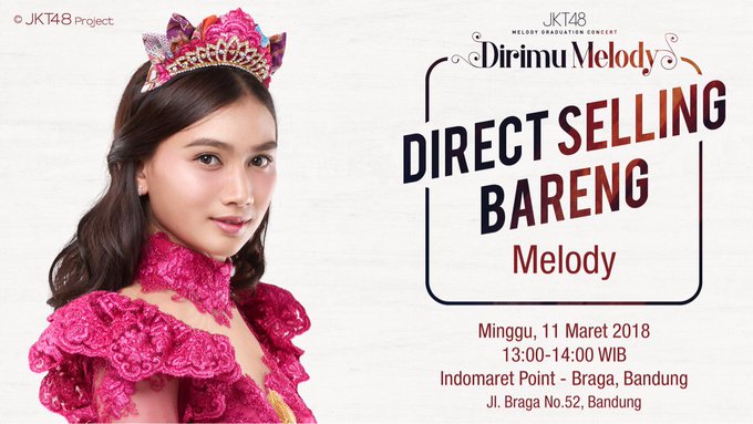 JKT48@officialJKT48 Yang di Bandung jangan lupa untuk hadir di Indomaret Point Braga karena ada Direct Selling bersama @melodyJKT48 hari ini di jam 13.00 WIB. Ajak teman-teman kamu ya! #MelodyGraduationConcert pic.twitter.com/xKwfpMHc6B