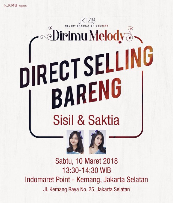 JKT48@officialJKT48 Jangan lupa ya ramaikan Direct Selling hari ini di Indomaret Point Kemang pada jam 13.30 WIB, ada @Sisil_JKT48 dan @Via_JKT48 yang akan menemani kalian di sana. #MelodyGraduationConcert pic.twitter.com/qflx8pc1Uc