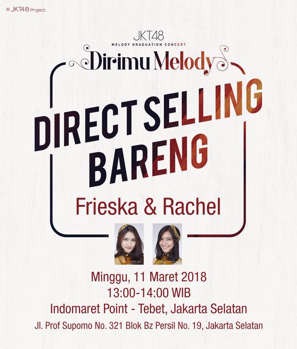 JKT48@officialJKT48 Ayo, jangan sampai telat untuk hadir ke Direct Selling Melody Graduation Concert di Indomaret Point Tebet! @frieskaJKT48 dan @Rachel_JKT48 masih menunggu kamu loh! #MelodyGraduationConcert pic.twitter.com/nRaNqLOhyo