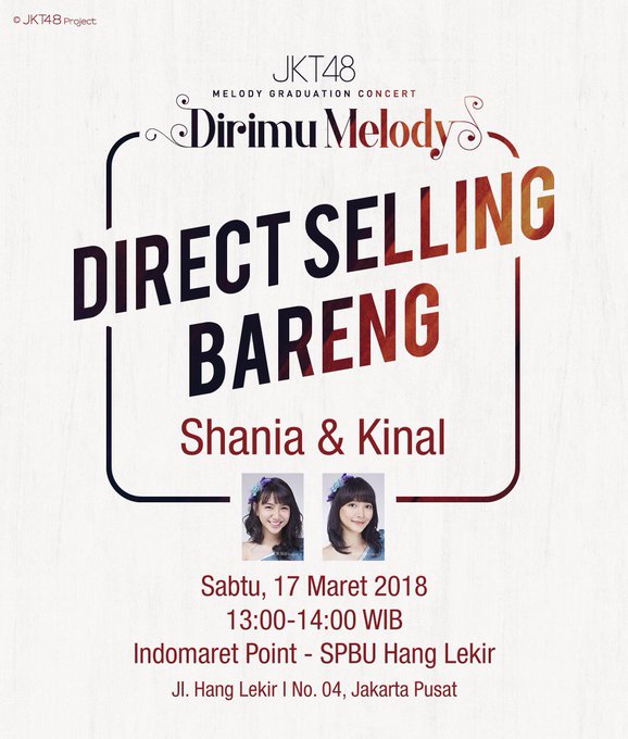 JKT48@officialJKT48 Ramaikan Direct Selling Dirimu Melody Concert Bareng @shaniaJKT48 dan @kinalJKT48 besok, 17 Maret 2018 di @IndomaretPoint SPBU Hang Lekir di jam 13:00-14:00 WIB yuk! Habis itu theater-an deh... pic.twitter.com/Qv09AupV9F