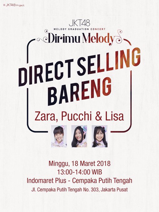 JKT48@officialJKT48 Besok, 18 Maret 2018, Direct Selling Melody Graduation Concert juga ada di Indomaret Plus Cempaka Putih Tengah. Yang bakalan hadir yaitu @zaraJKT48 @Pucchi_JKT48 dan @Elisabeth_JKT48 loh di jam 13:00-14:00 WIB! Ayo ramaikan! #MelodyGraduationConcert pic.twitter.com/5aePsdCxwi