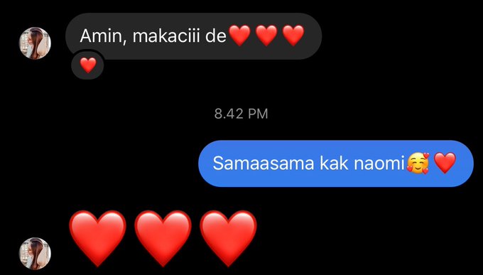 Amirah Fatin@F_MiraJKT48 -- Ngeliatin ig storynya kak naomi seneng bgt🥰 Shinta Naomi@ShintaNaomi -- @F_MiraJKT48 Hihi luvv🥰 Amirah Fatin@F_MiraJKT48 -- @ShintaNaomi Hihihi🥰❤️❤️