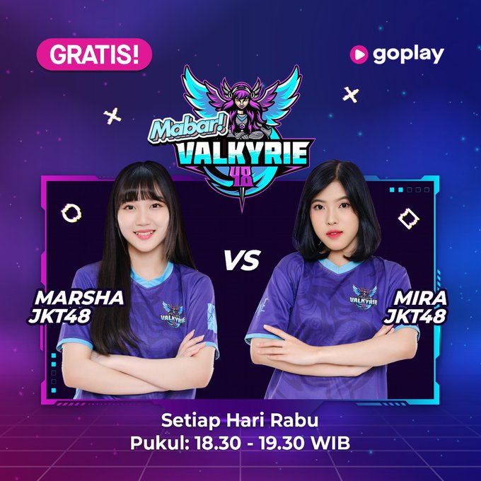 Wah! Hari ini pertarungan @F_MiraJKT48 dan @L_MarshaJKT48 pasti seru! Jangan lupa ya saksikan malam ini dalam program “Mabar! Valkyrie48” pukul 18.30 WIB, livestreaming hanya di @GoPlayIndonesia ! bit.ly/GoPlayLive_JKT… pic.twitter.com/e8xjnLfgCT