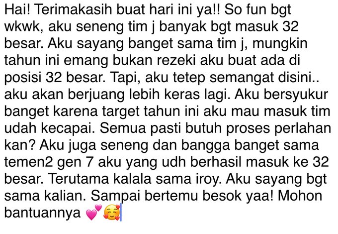 Terima kasih semuanya!!!💕💕seneng banget sampe g bisa berkata kata😭 semoga ini awal kesuksesan kita y😊 walau aku bakal ketutup sama kakak yg lbh tinggi, aku yakin bkn hanya ragaku yg pantas terlihat tp semangatku juga🥳🥳 semoga di posisi #31 aku bisa menampilkan yg terbaik✨ pic.twitter.com/2rkTQfzDJM