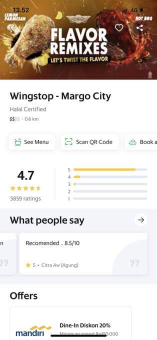 Cindy Hapsari@CindyHapsari_ fix aku wingstop aja deh wkwkwk, td baca2 di GrabFood Dine-In reviewnya bagus2 🤩 Oh iya, katanya Dine In ini udh available dibeberapa kota besar jg, kayak Jakarta, Bandung, Surabaya, Semarang. Jogja, Bali, dan Medan Skrg cari makan udh bebas deh dari kata “terserah makan dimana”