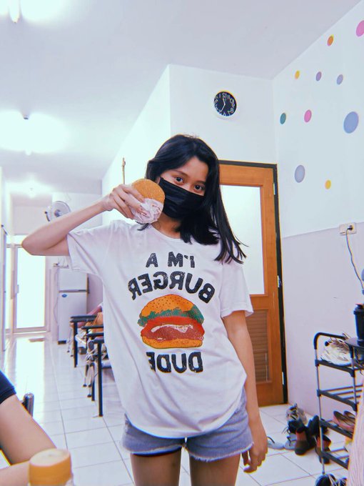 Tadi ka febi fotoin aku lagi pegang burger slnya sama kyk baju aku burger juga trs , burger nya jatoh dan gajadi di makan :) @K_FebiJKT48 pic.twitter.com/6JsY6BcBw0