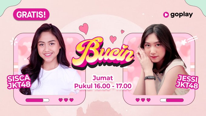 Yuhuuuuu!! Bucin kali ini ada @S_SiscaJKT48 dan @C_JessiJKT48 yang akan berbagi cerita sekaligus mendengarkan curhatan kalian! Jangan lupa nonton ya sore ini dalam program “Bucin” pukul 16.00 WIB, livestreaming hanya di @GoPlayIndonesia bit.ly/GoPlayLive_JKT… pic.twitter.com/vtYGCSRLbB