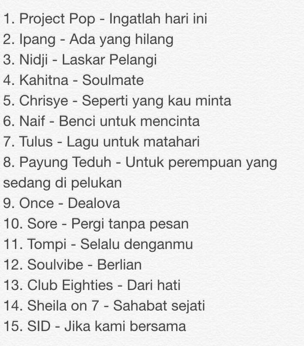Oya ini buat yg kmrn tanya playlist Lagu Indonesia aku.. 15th most played songs this week. Here it is✌️ pic.twitter.com/S4GOZrmoit