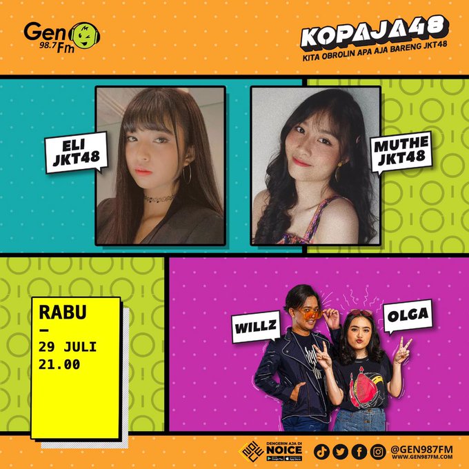 Helisma Mauludzunia Putri Kurnia@H_EliJKT48 -- Ayo sobadddd today🥰 twitter.com/gen987fm/statu… IG: @gen987fm Siap siap malem ini ditemenin sama @A_MutheJKT48 @H_EliJKT48 @MisterWillz @olgaagata di #kopaja48! Dengerin siarannya di jam 21.00 dan tonton #Kopaja48Live di jam 20.30 💚 mau titip pertanyaan? Reply tweet ini yaaa.. pic.twitter.com/NSzkiMWB8l