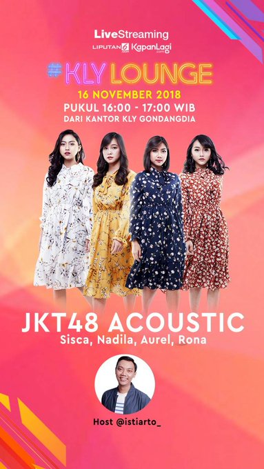 Saksikan penampilan JKT48 Acoustic streaming di @liputan6dotcom @KapanLagicom @vidiodotcom pada tanggal 16 November 2018 pada pukul 16:00-17:00 WIB! Catat tanggal dan jamnya ya! #JKT48acoustic #KLYlounge pic.twitter.com/N99vxpfwCo