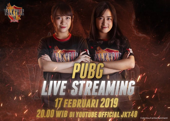 Saksikan live streaming pertama team E-Sports JKT48, Valkyrie48! Para bidadari pejuang ini akan bermain game PUBG di YouTube Official JKT48 pada tanggal 17 Februari 2019 pukul 20:00 WIB. Wajib nonton! #JKT48esports #Valkyrie48 pic.twitter.com/C51mnomv2i