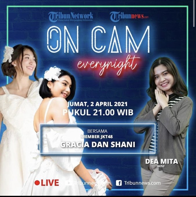 Hari ini jam 21:00 WIB @N_ShaniJKT48 dan @S_GraciaJKT48 akan hadir dalam acara "On Cam Everynight" di Youtube, Facebook, dan IG Live @tribunnews. pic.twitter.com/EjdDdcRELy