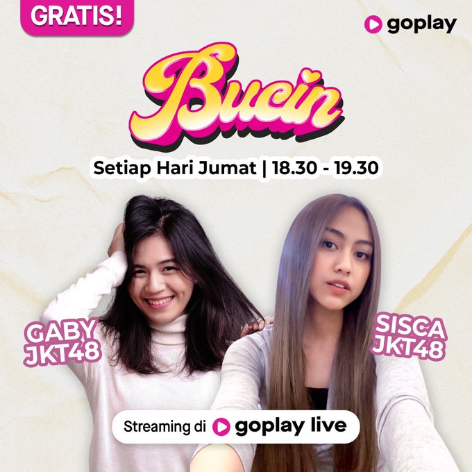 Saksikan @gabyJKT48 dan @S_SiscaJKT48 ngobrol dan menemani curhat kalian dalam program Bucin! Malam ini pukul 18.30 hanya di @GoPlayIndonesia ! #JKT48DIGOPLAYLIVE #JKT48Bucin bit.ly/GoPlayLive_Buc… pic.twitter.com/NGNyF5QFuV