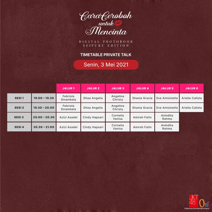 JKT48@officialJKT48 Berikut adalah jadwal Private Talk Event with JKT48, 3 Mei - 5 Mei 2021. pic.twitter.com/8q7DmerViA