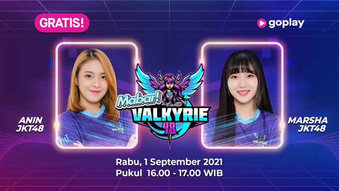 Selamat siang! Siap siap hari ini untuk audisi mabar bareng @R_AninJKT48 dan @L_MarshaJKT48 dalam program “Mabar! Valkyrie48” pukul 16.00 WIB, livestreaming hanya di @GoPlayIndonesia bit.ly/GoPlayLive_JKT… pic.twitter.com/MmW5202sgh