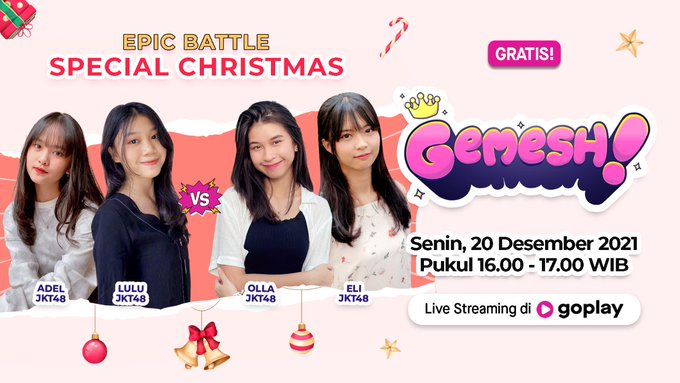 Selamat pagi semua! Apa kabar? Kalau Natal sudah dekat tandanya liburan pun sudah dekat! Kali ini Gemesh akan hadir dengan pesona natal bersama @F_OllaJKT48 @R_AdelJKT48 @H_EliJKT48 @A_LuluJKT48
