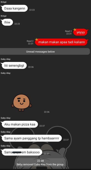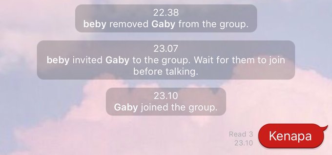 Beby Chaesara@bchsr_ -- Bye. pic.twitter.com/CvsBxJwuyW Gabriela Margareth@gabyJKT48 -- @bchsr_ Emg orgny sk gimmick aj pic.twitter.com/92JIormVNZ Beby Chaesara@bchsr_ -- @gabyJKT48 Kasian soalnya, gak punya geng kan kamu. Gabriela Margareth@gabyJKT48 -- @bchsr_ Emg kalo punya hrs laporan km? Mutiara Azzahra@A_MutheJKT48 -- @gabyJKT48 @bchsr_ @A_ChristyJKT48 nanti kalo kita dah gede kita gini jugaa yuuuk!! Angelina Christy@A_ChristyJKT48 -- @A_MutheJKT48 @gabyJKT48 @bchsr_ kita bukannya skrg udah gede? 🤪