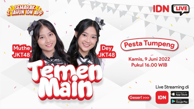Jangan lupa, hari ini ada @A_MutheJKT48 dan @A_DeyJKT48 di IDN LIVE mulai pukul 16.00! #Semarak2TahunIDNApp #SeruBarengIDNLive mobile.twitter.com/idn_app/status…