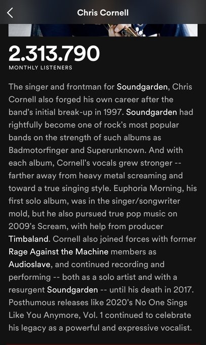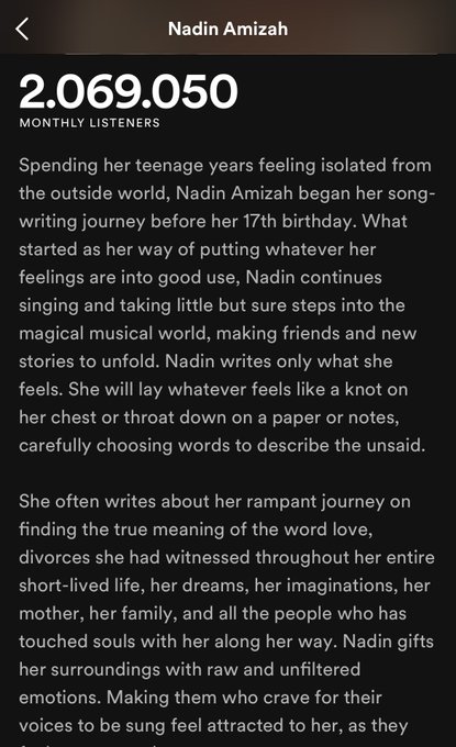 1 hal yg selalu aku perhatiin ttg musisi luar, yg "biasanya" aku dengar lagu2nya. profile di spotify mereka tuh lengkap banget isinya, seperti mini biografi.