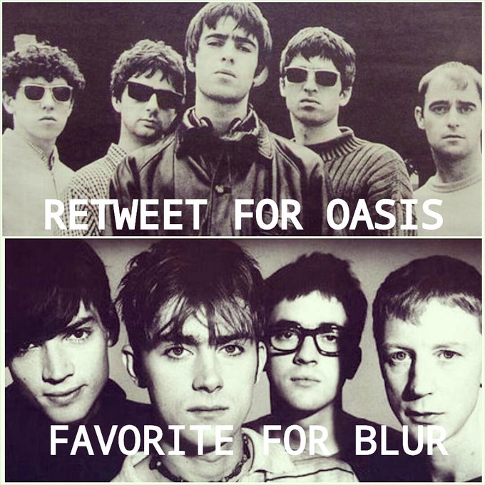 Cara memilihnya gampang bgt! Pantengin twit aku setelah ini ya, retweet kalau kalian pilih Oasis dan favorite kalau kalian pilih Blur. Okay?