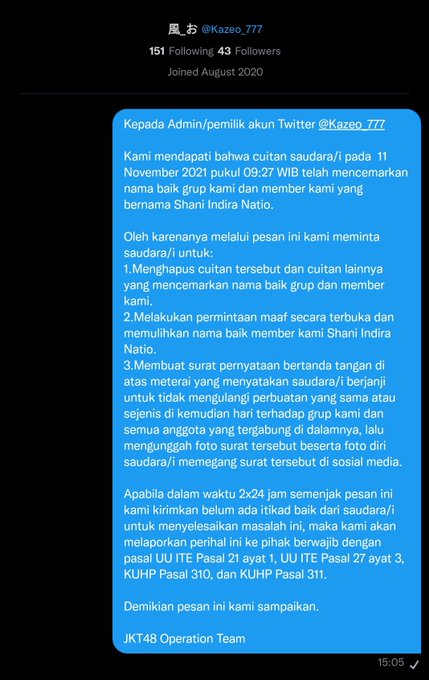 Shani Indira Natio@N_ShaniJKT48 -- 😊 twitter.com/officialJKT48/… JKT48 Kami telah mengirimkan peringatan kepada pemilik akun @Kazeo_777 atas pencemaran nama baik. Bila tidak merespon dalam kurun waktu 2x24 jam, kami akan menindaklanjutinya ke pihak berwajib. pic.twitter.com/AgBr9lUQsR