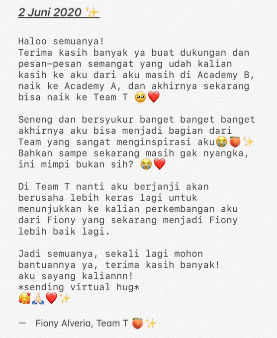 Fiony Alveria Tantri@A_FionyJKT48 -- Terima kasih banyak semuanya! Mohon bantuannya ya, aku sayang kalian 🥰❤️❤️ pic.twitter.com/oL6zPwOPen Shania Gracia グラシア@S_GraciaJKT48 -- @A_FionyJKT48 Fionyy selamat cantiik🥰🥰 Fiony Alveria Tantri@A_FionyJKT48 -- @S_GraciaJKT48 Makasih banyak ci Gracia 😭❤️✨🙏🏻