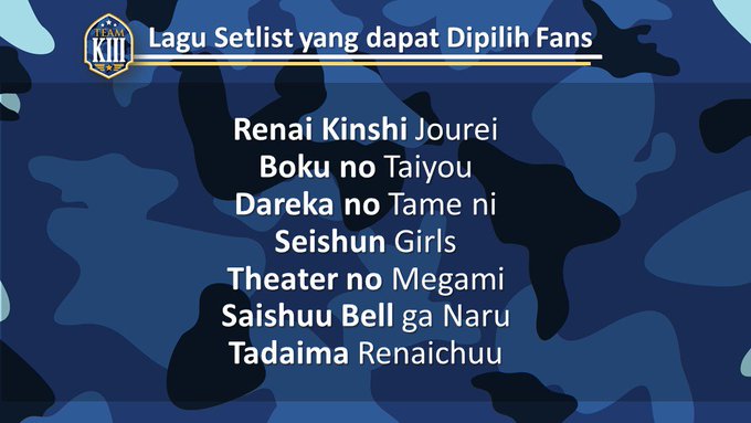 Kemarin juga sudah diumumkan fanbase yang terpilih untuk menjadi produser produce setlist team KIII, diharapkan fanbase terpilih bisa berkoordinasi dan terbuka untuk saran-saran fanbase lainnya. Berikut adalah list setlist yang dapat dipilih. pic.twitter.com/XhqaaNY8m3